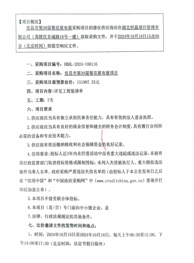 宜昌市第39届菊花展布展采购项目比价邀请函
