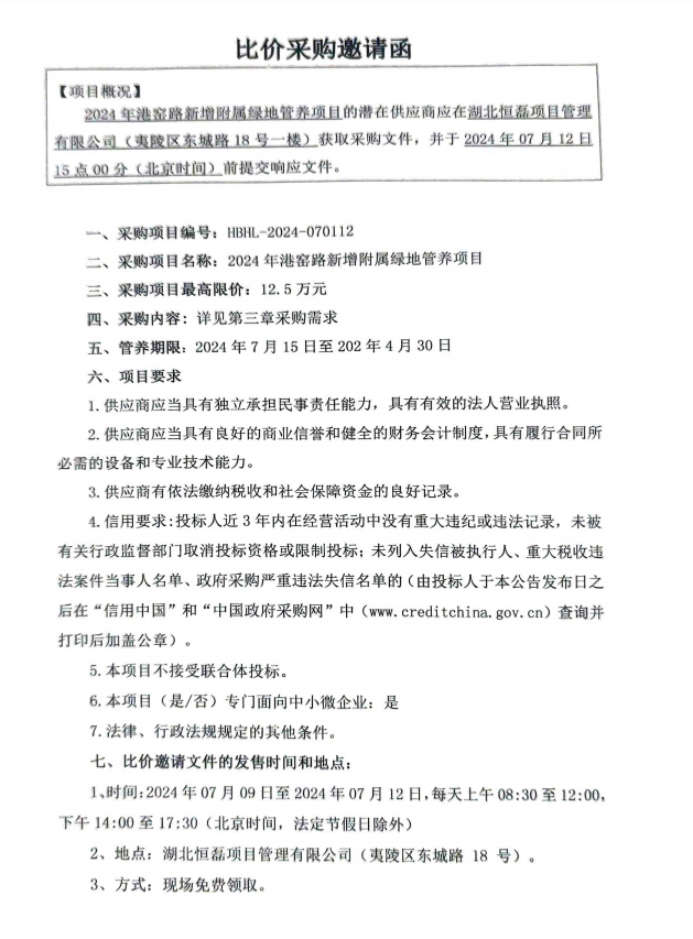 2024年港窑路新增附属绿地管养项目比价邀请函